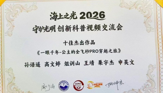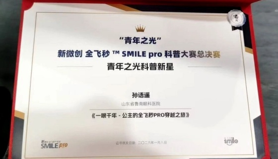 鲁南眼科医院屈光手术科孙语遥医生携团队精心打磨的科普视频作品《一眼千年-公主的全飞秒PRO穿越之旅》惊艳亮相,凭借扎实的专业功底、前沿的科普创新能力及出色的现场表现,一举斩获“全飞秒青年之光·科普新星”荣誉称号及“海上之光 • 创新科普作品交流会十佳杰出作品”两项荣誉,为屈光领域科普事业注入鲜活活力,也为推动行业科普工作规范化、创新化发展贡献了青年力量。
